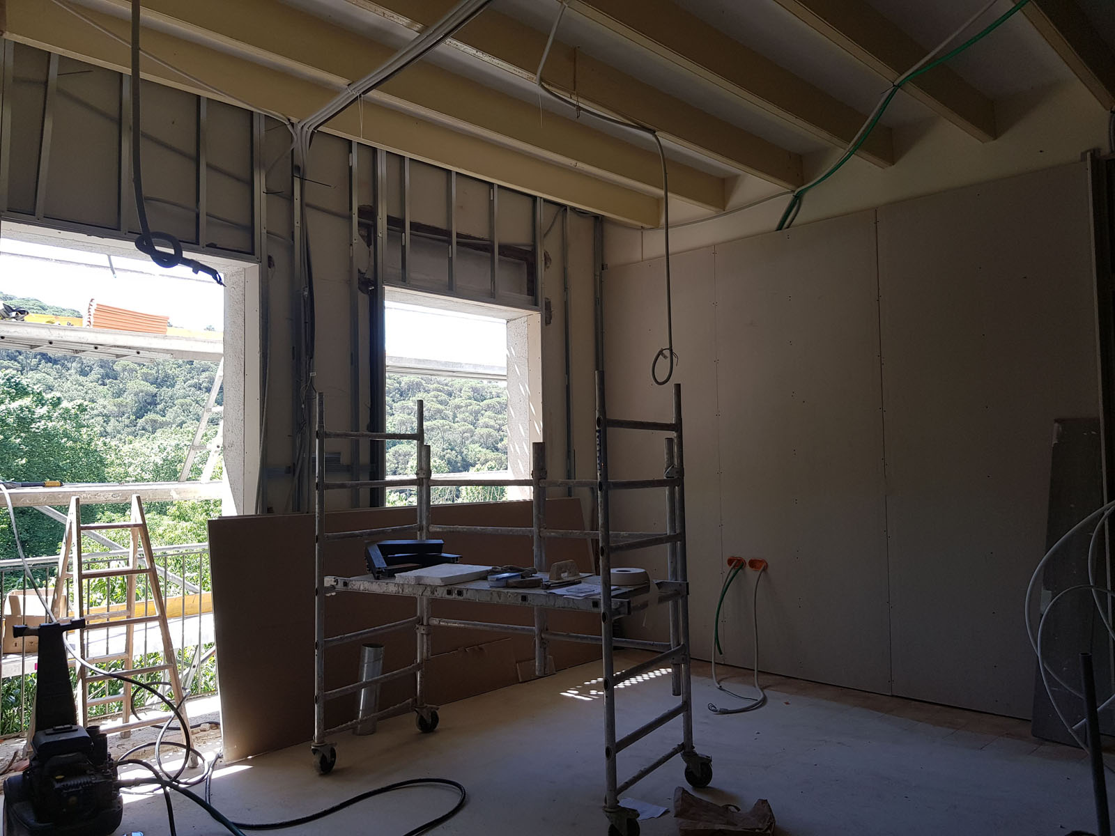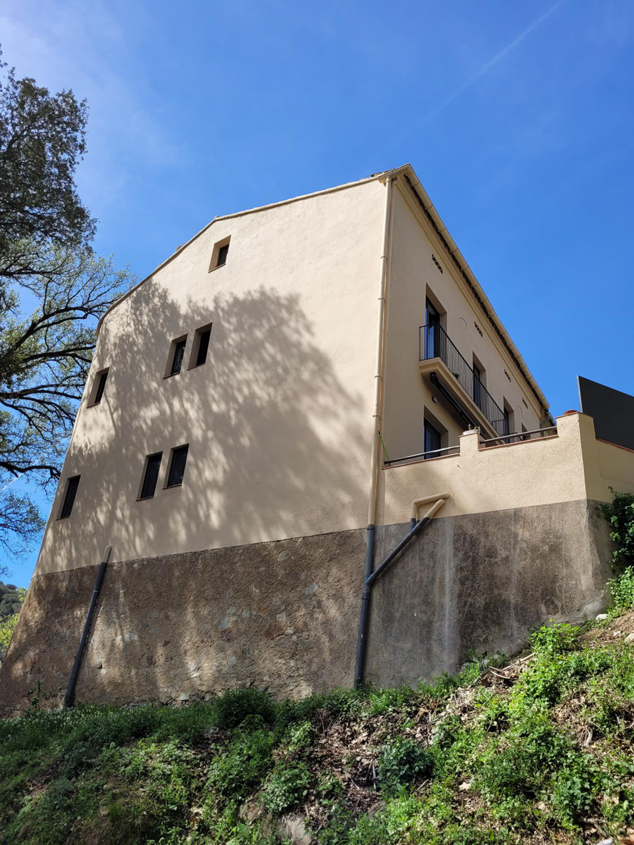 Proyecto de gran envergadura centrado en la recuperación y modernización técnica de una masía de tres niveles en Sant Vicenç de Montalt. La intervención técnica comenzó con un exhaustivo refuerzo de la estructura original para garantizar la estabilidad y seguridad del edificio a largo plazo. Se implementaron métodos avanzados de corte de capilaridad y equipos especializados para el tratamiento definitivo de humedades, asegurando la salubridad de los muros centenarios.
