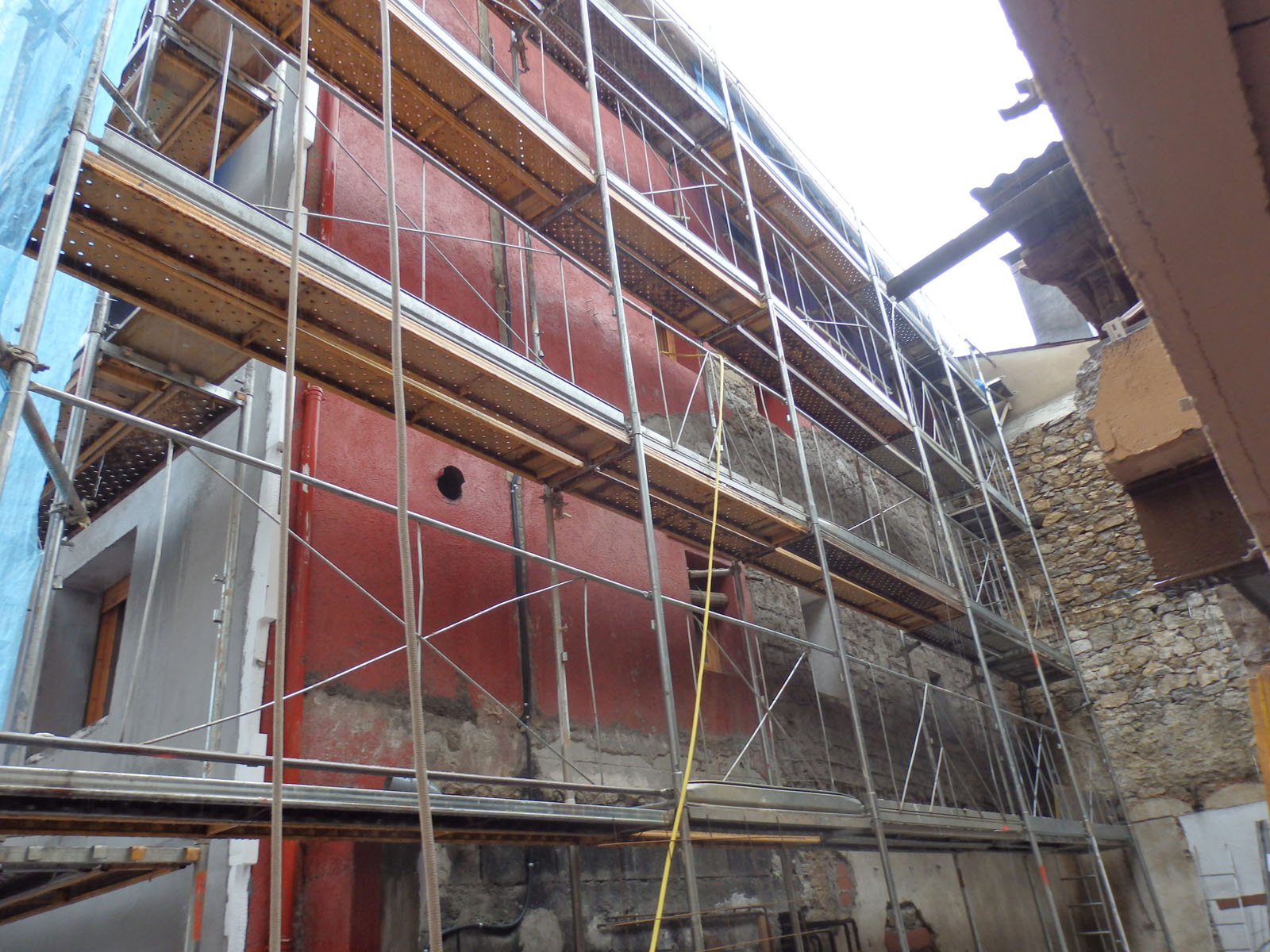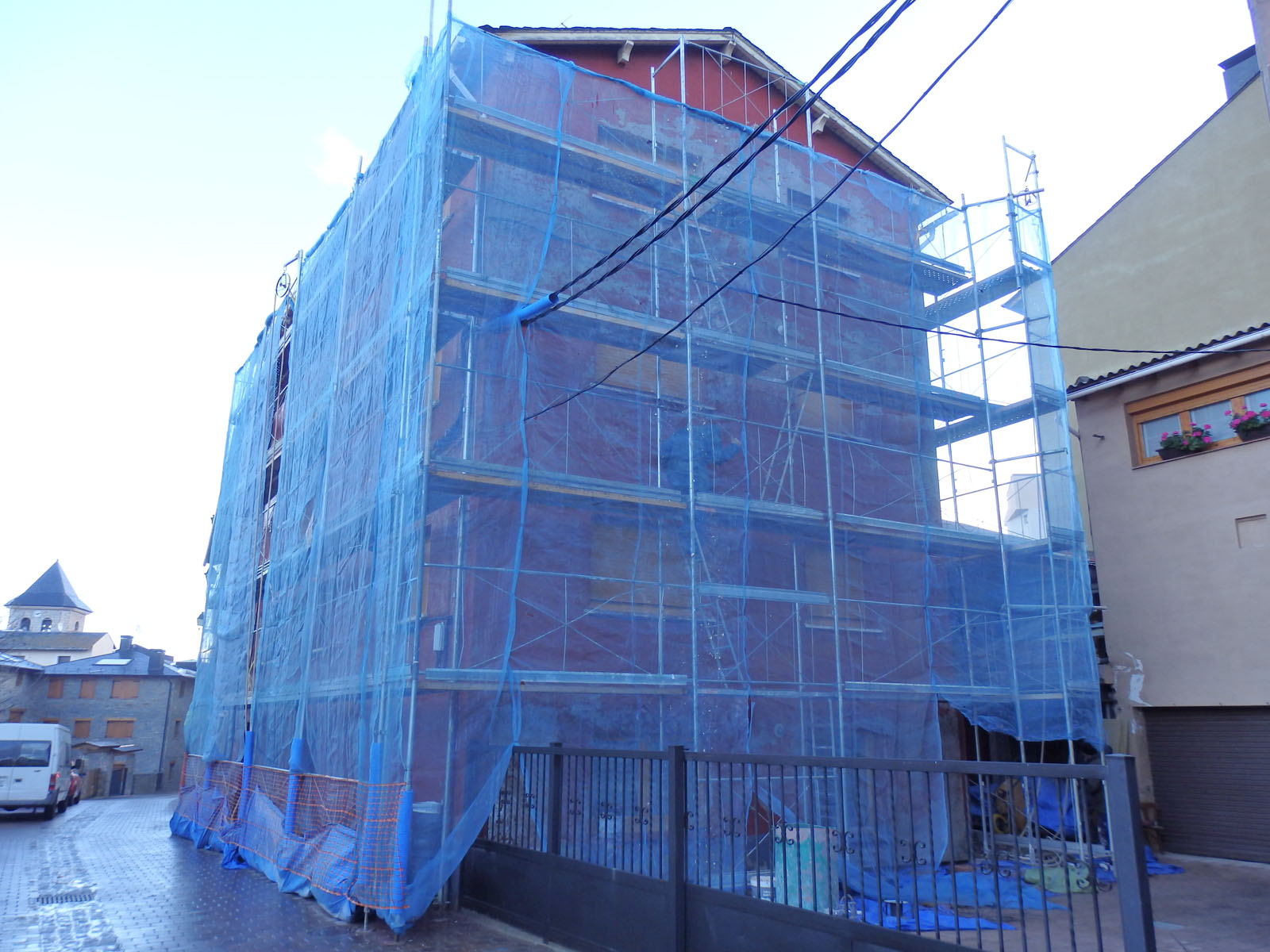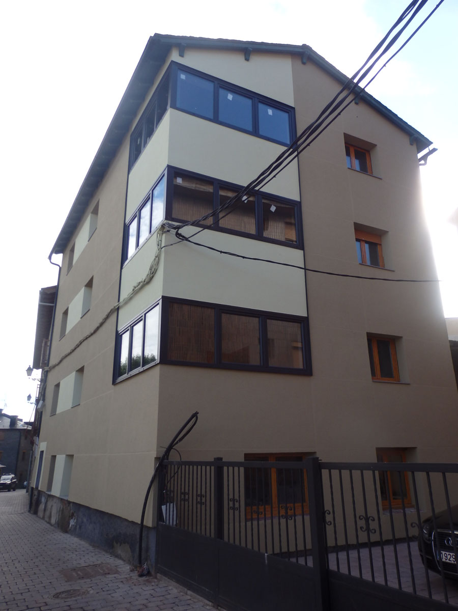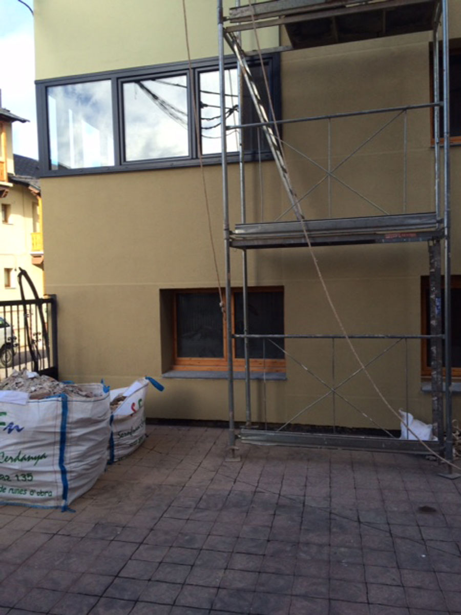 Proyecto de rehabilitación integral centrado en la recuperación y protección de un edificio plurifamiliar en Alp. La intervención principal consistió en el repicado completo de la fachada original debido a su avanzado estado de deterioro, procediendo a un nuevo revestimiento y pintado con materiales de alta resistencia climática. Para garantizar la máxima eficiencia térmica y estanqueidad en un entorno de nieve y alta montaña, se sustituyó toda la carpintería exterior por sistemas de aluminio de altas prestaciones. La obra se completó con la reforma interior de cuatro viviendas, logrando un equilibrio perfecto entre estética renovada y protección estructural frente a los elementos.